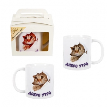 ЧАША КЕРАМ. КОТЕ "Добро утро!" Н7см Ф7см В КУТИЯ С ПОЖЕЛАНИЕ