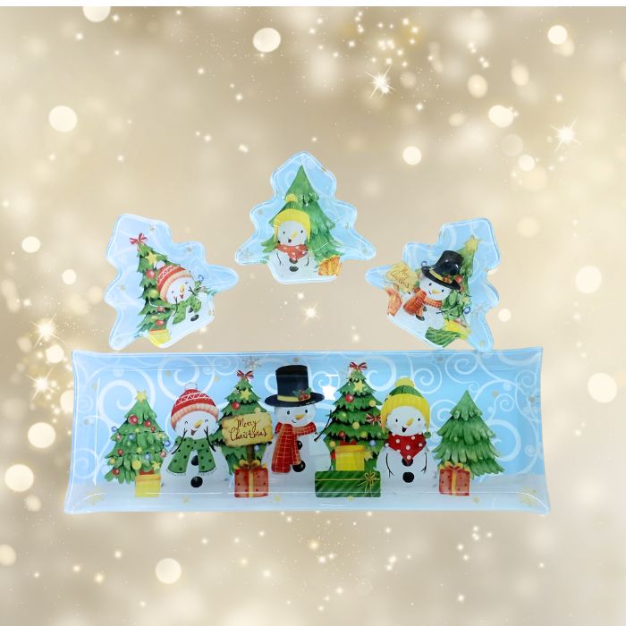 К-КТ СТЪКЛЕНО ПЛАТО 35х12см + 3бр. КУПИЧКИ Ф12см КОЛЕДНИ СНЕЖКОВЦИ