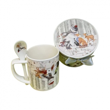 ЧАША ПОРЦ. КОЛЕДНА С ЛЪЖИЧКА СНЕЖКО С ГОРСКИ ЖИВОТНИ Ф7,5см Н9см ПОД.КУТ.
